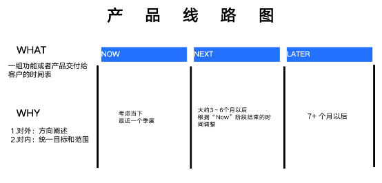 产品线路图就好比一场战役的作战计划,能清晰看到我们产品未来发展方向,下一个季度是要推出什么功能,能解决什么问题;半年后我们产品又会是什么样子,能在市场中能否一席之地;未来12个月后又会是什么样子,一幅产品线路图清晰展现在我们的脑海里,知道为什么要做,知道会做成什么样子,知道如何做,做到“知行合一”,即使路上有各种坎坷,我们也不会害怕,坚定我们产品会成功,能走向正确的彼岸。