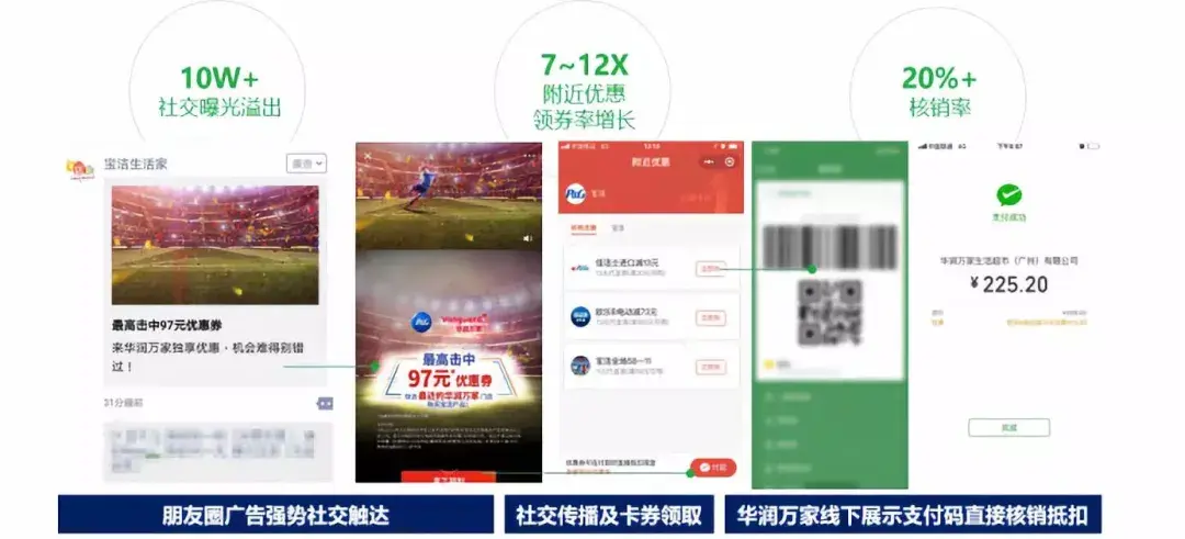 世界杯期间,宝洁选择以自己“宝洁生活家”的账号亲自投放朋友圈广告,并定向华润万家会员及相似人群,成功吸引了众多消费者点击广告--“附近优惠”小程序领取宝洁优惠券--华润万家购买宝洁指定单品核销优惠券。活动期间“附近优惠”领券率同比增长7-12倍,而优惠券的核销率也突破了20%。