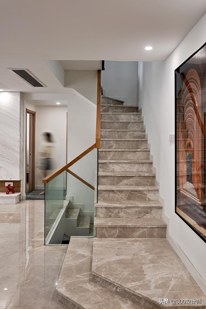 新增连接每层楼的楼梯,日常生活更加方便。“之”字形结构,很好的和原始建筑结构融合,同时,节约了空间。古堡灰石材踏步的楼梯轻奢大气,与侧面一样的纹理,保持整体的统一与和谐。