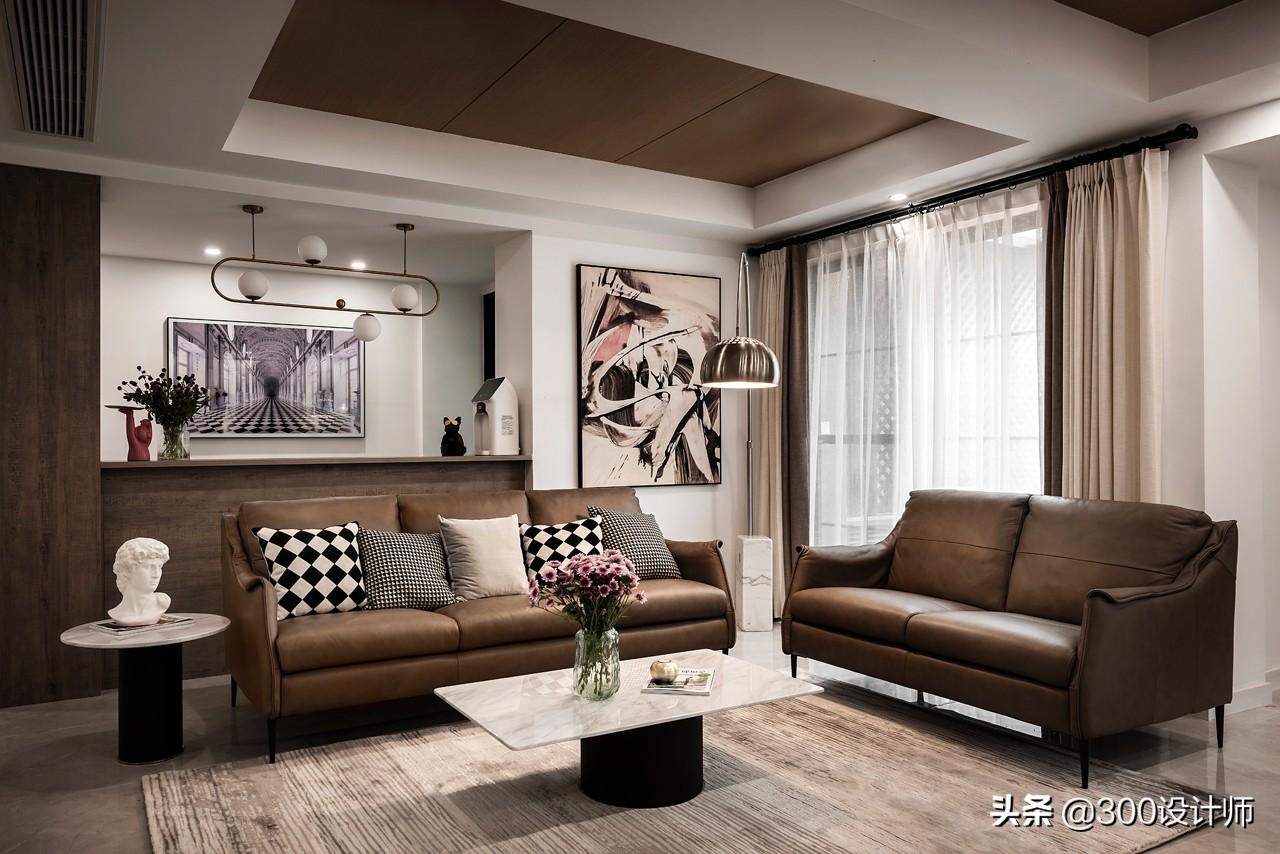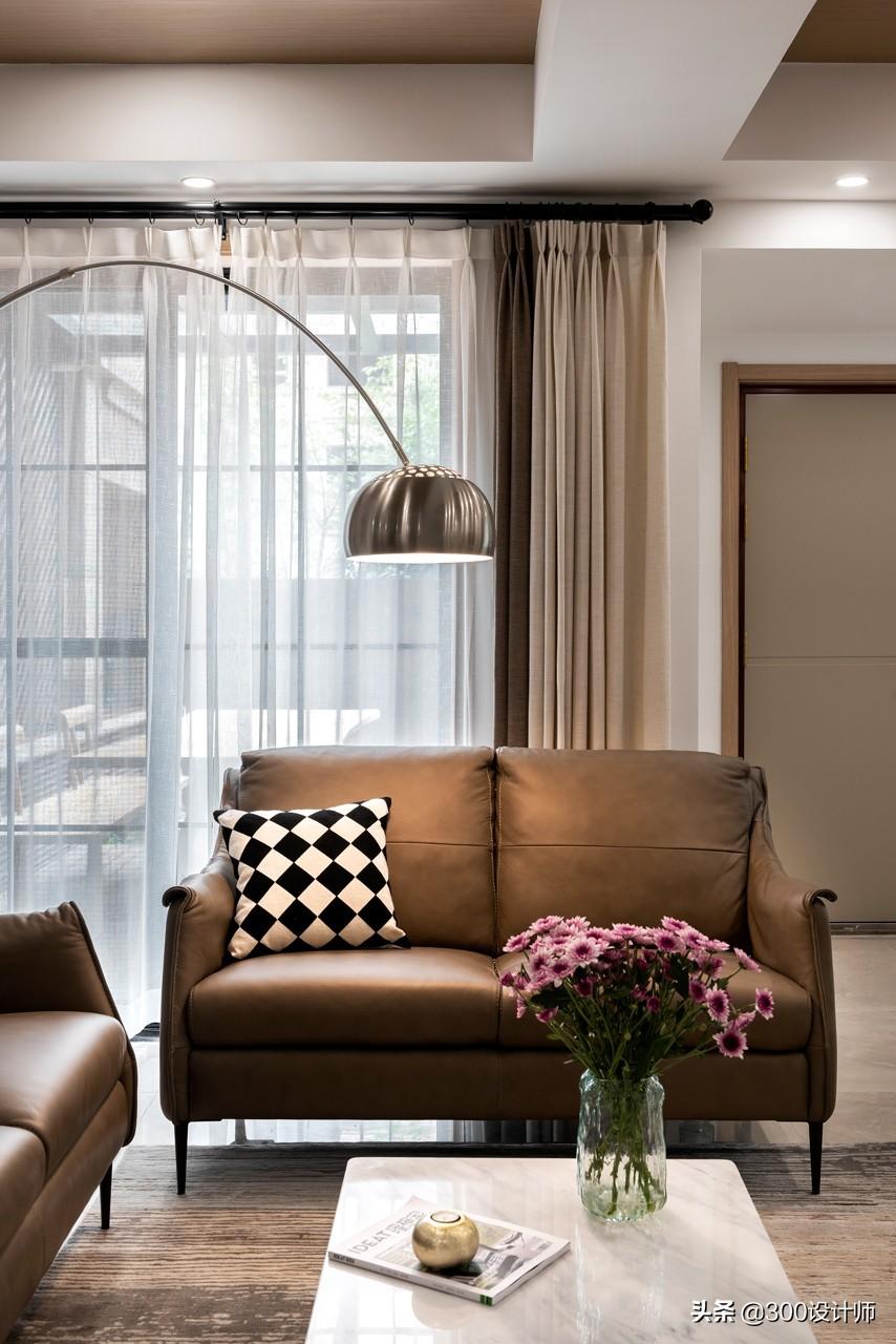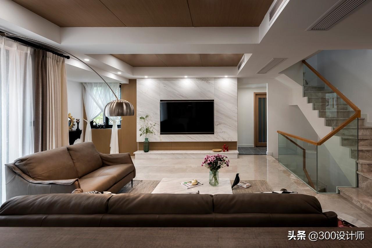 为了弥补客厅采光不足。设计师在电视背景墙侧面开了一扇窗,引进部分自然光线。顶面的梁刷白,其余部分用木饰面覆盖,不论是材质还是色调都是墙面的延伸,整体和谐统一。