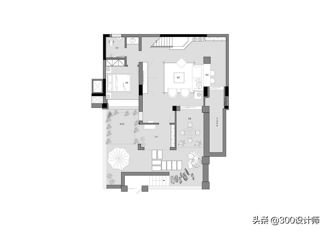 一层是家庭的主要活动空间,包括客厅、茶室、庭院以及老人房。吧台与客厅自成一体,不论是和家人闲聊还是和朋友聚会,都自在惬意,符合当代年轻人的社交需求。