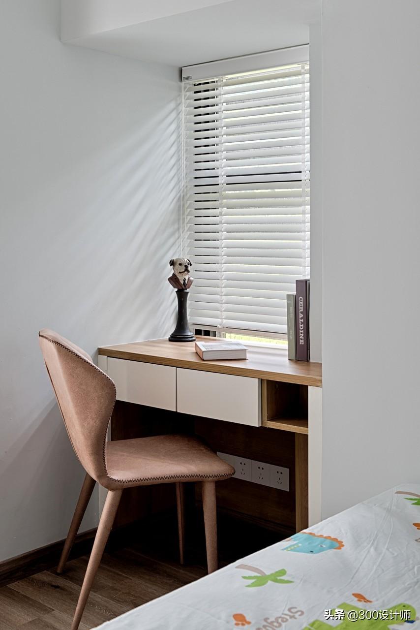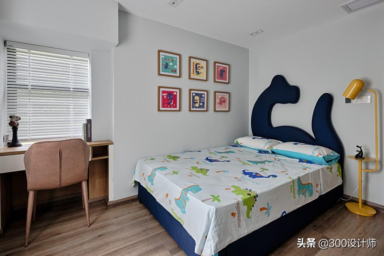 儿童房包括衣帽间、书桌,给孩子独立且完整的空间。在不脱离整体风格的基础上,蓝白相间,木材与布艺为主,在温馨的色调与用材之下,卡通元素成为儿童房的点缀,烘托出孩子的天真烂漫,让孩子感受到家的温暖。