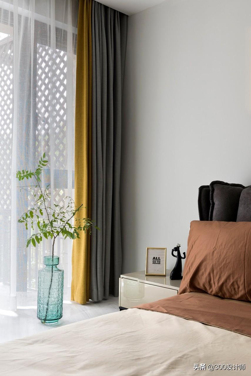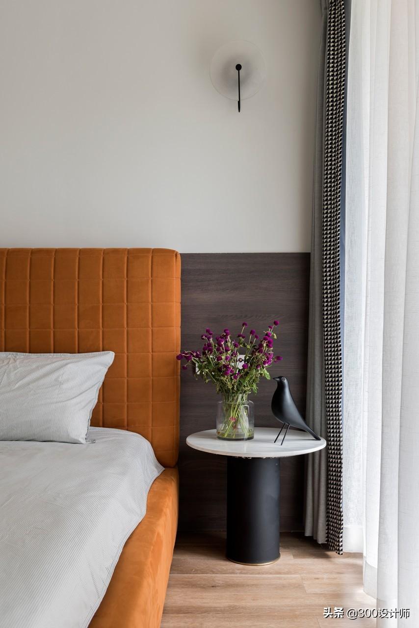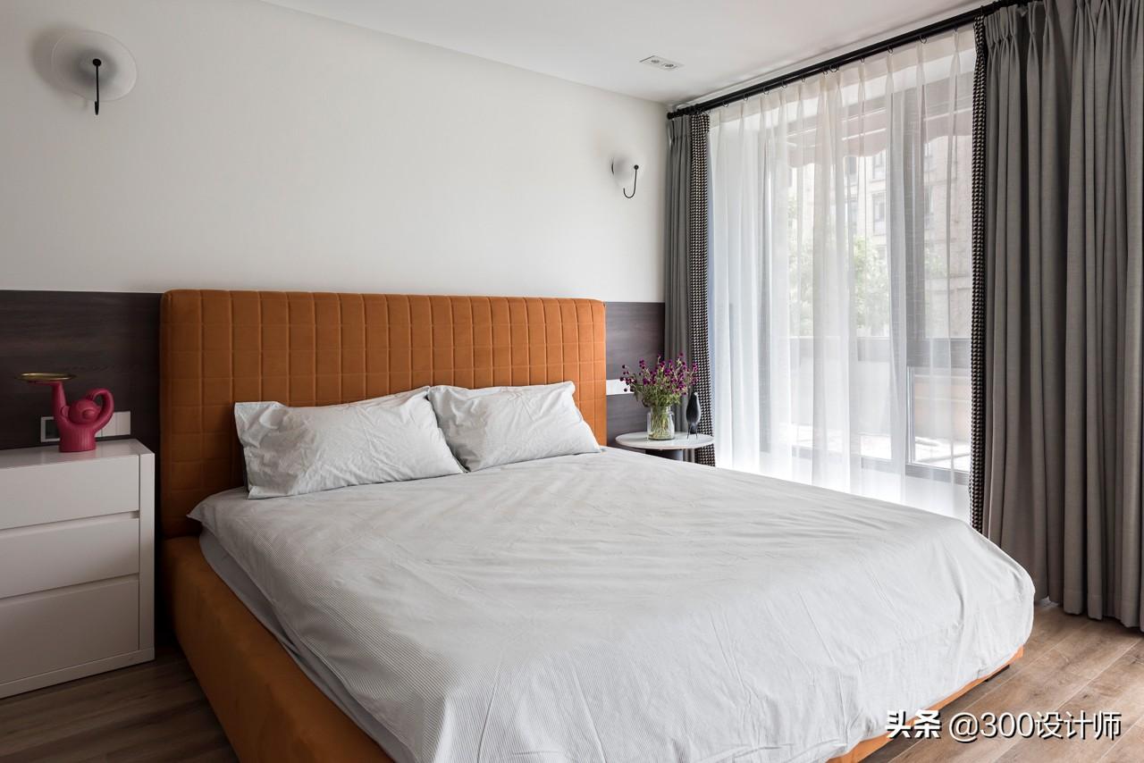 主卧的设计延续整体的简约风格,落地窗将大片天光云影引进室内,暖橙的床仿佛室外明媚的阳光,给人暖洋洋的舒适感。布艺、原木、铁艺,散逸空间的多元层次感,勾勒轻盈、浪漫的现代美居。