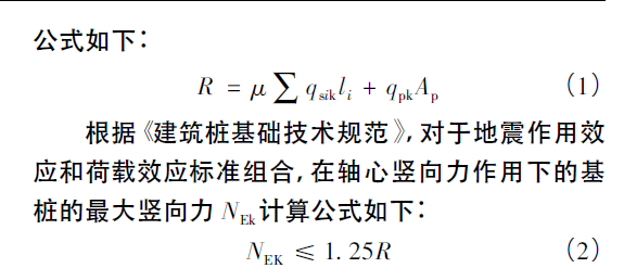 根据该工程上部结构抗震承载力计算得出加固前底层柱最大轴力NEk,再通过岩土工程勘察资料和设计图纸中灌注桩的尺寸、基桩持力层等设计,经过计算后得出设计单桩竖向承载力特征值R,计算