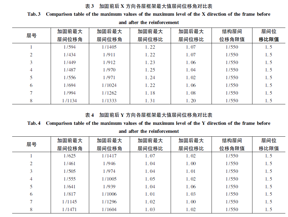结构经加固后,最大层间位移满足《建筑抗震设计规范》要求,最大层间位移比满足《高层建筑混凝土结构技术规》要求,结构的变形满足规范要求[9]。结构加固前后最大位移角、位移比对比详见表3、表4。