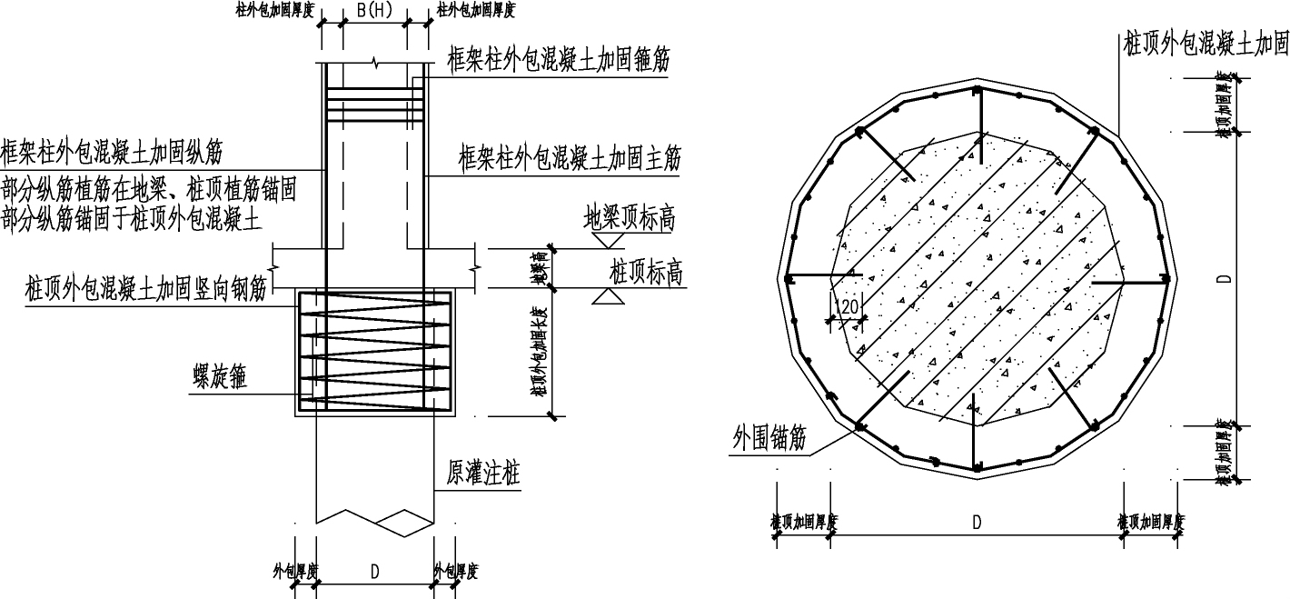 了改变[5]。对于外包混凝土增大截面法加固的框架柱,柱外包混凝土增大截面法加固钢筋需在灌注桩顶生根,处于桩周范围内的钢筋采用植筋锚固,处于桩周范围外的钢筋锚固与桩顶加固桩帽钢筋混凝土中,桩顶外包混凝土桩帽加固做法详见图5。框架柱加固由外包混凝土增大截面法向粘钢外包钢法过渡做法详见图6,框架柱顶加固锚固做法详见图6。