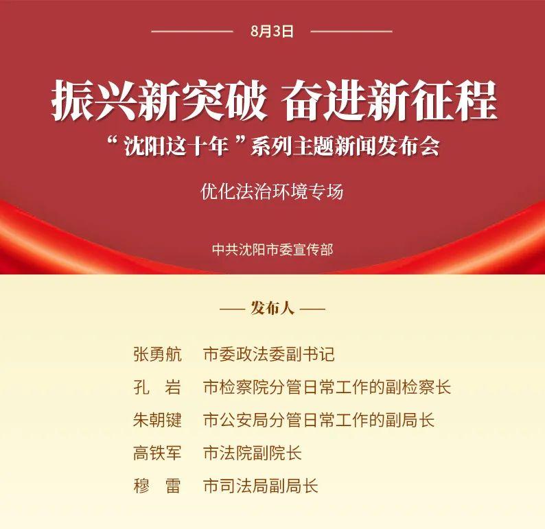 振兴新突破,奋进新征程。8月3日,在“沈阳这十年”系列主题新闻发布会优化法治环境专场,沈阳市中级人民法院党组成员、副院长高铁军作新闻发布,向媒体介绍了沈阳法院的“十年成绩单”,并回答了记者提问。