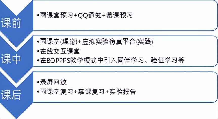 按课前-课中-课后的顺序,利用“雨课堂”、QQ即时通信工具、腾讯会议、录屏软件全方位、多模式、立体地将上课视频、学习材料和信息及时的推送给学生。