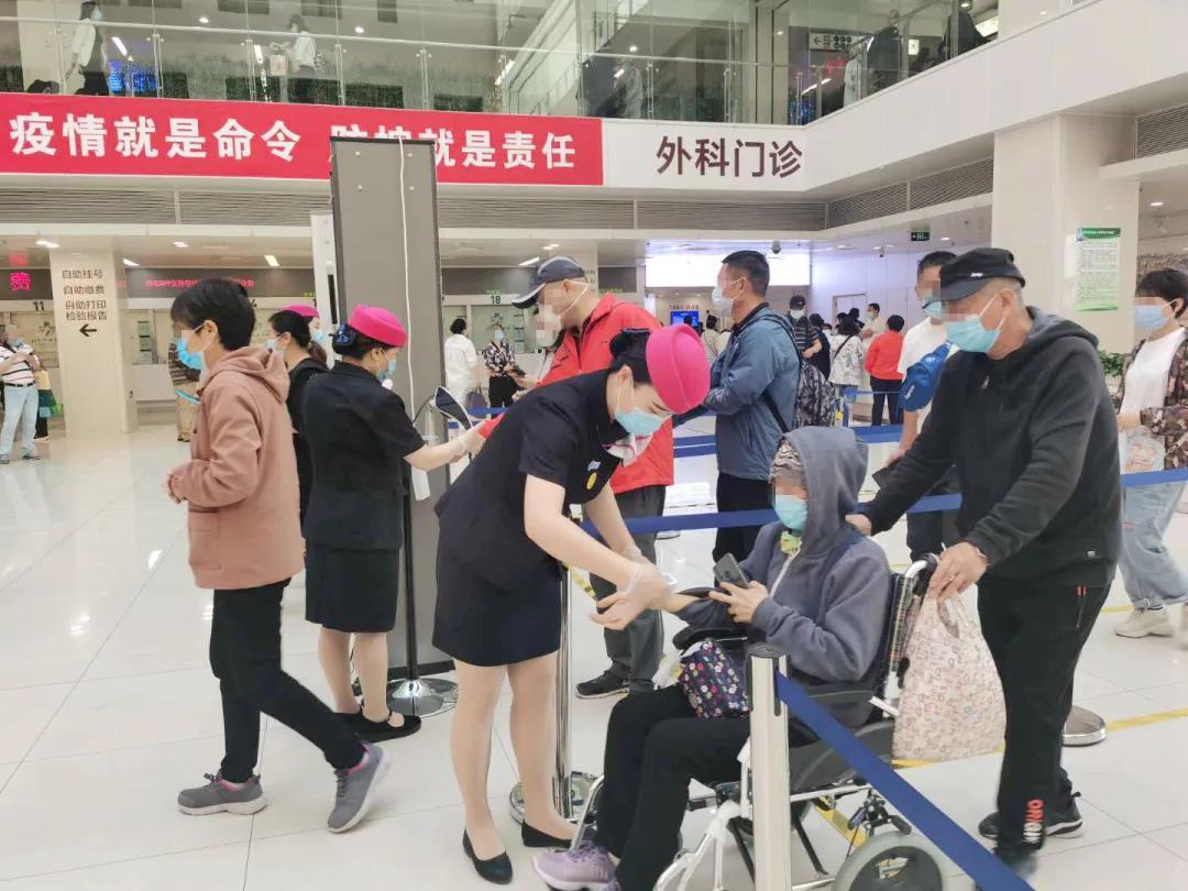 疫情防控的"安全线"设到了门诊广场,相当于门诊咨询台也搬到了广场,工作人员除了要解答患者的防控相关问题,如"我从××来,需要隔离14天吗?""我想查核酸,该怎么办?"还要回答各种应接不暇的咨询,"我的腿疼,该挂什么科?""我的身份证可能丢在医院了,怎么办?"一线的工作人员用他们的耐心、细心和责任心,为患者提供热情周到的服务。