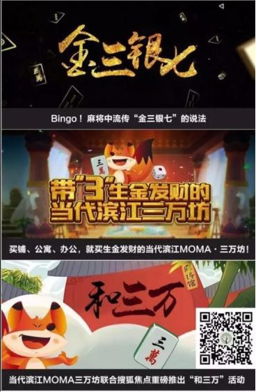 在确定了以“麻将”为活动主题之后,当代滨江MOMA·【三万坊】联合一大网络平台的PC端和手机端平台,在长沙站的首页以一副胡三万的“麻将牌”占据大屏广告、通栏和弹窗,并配合WAP和APP端开屏、焦点图、底部通栏等广告位,形成霸屏之势,引发众多网友关注。一场关于“三万”的传播悄然拉开。