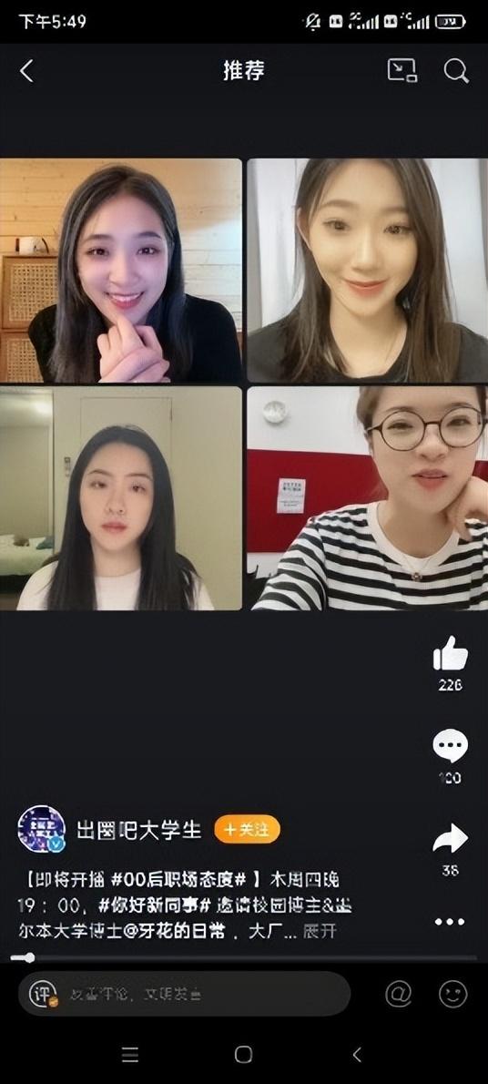 作为话题“气氛组”的校园博主,不只是通过个人微博账号向目标用户输出关于择业态度、职场初体验、价值观念的内容。在微博校园的组织下,来自海内外不同高校的四位校园博主,通过@出圈吧大学生 直播连麦,在线上分享职场态度与经验,也以最直接的形式参与到话题讨论中,在吸引粉丝持续关注话题的同时,形成了差异化的UGC产出。