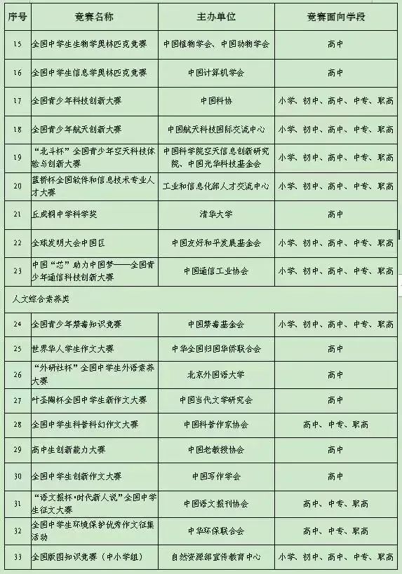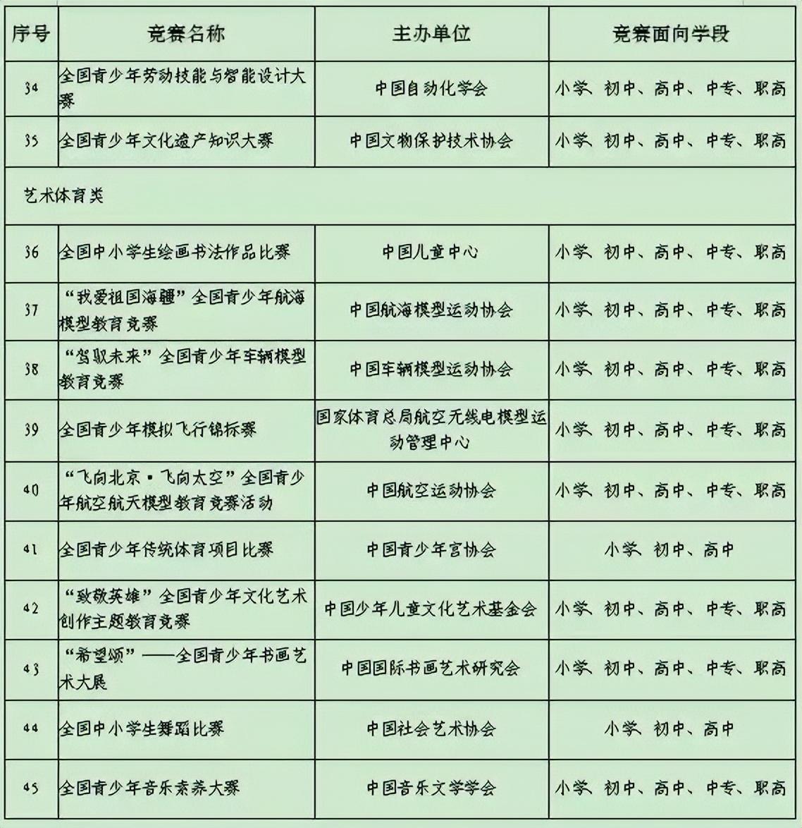 7.45项中小学生全国性竞赛活动名单公示:教育部拟确定全国青少年人工智能创新挑战赛等45项竞赛为2022-2025学年面向中小学生开展的全国性竞赛活动,举办时间原则上为2022年9月至2025年8月,在此期间每学年举办不得超过1次,累计不超过3次。(人民网)