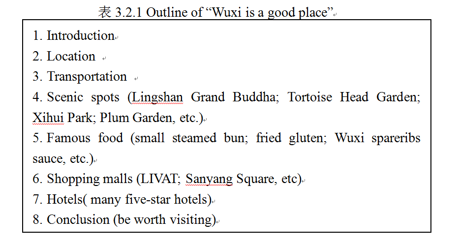 其次,教师组织学生共同罗列各段写作需要的重点词汇和基本句型,如旅游景点中的Lingshan Grand Buddha(灵山大佛); Tortoise Head Garden(鼋头渚)等,旨在帮助学生克服写作中的生词困惑,同时补充并扩大学生词汇量。