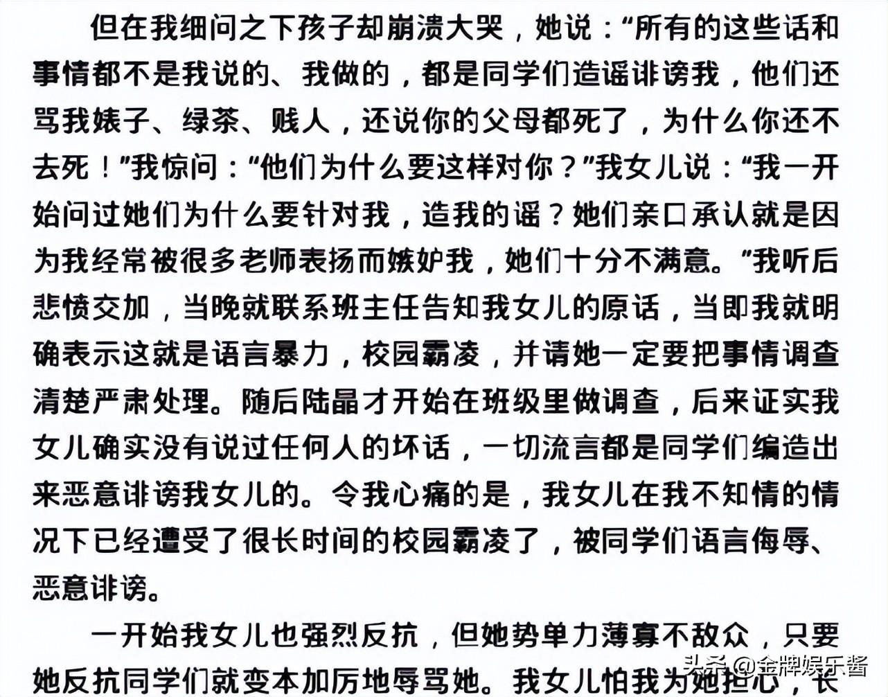 4.有人为播盖其纵客校园露凌的事实,居然对班级同学说邵一卜是跟她妈妈发生了矛盾才跳了楼。这是我们的第二次伤害。作为老师还带头歧视我们单亲家庭,诽谤我女儿的品德有问题