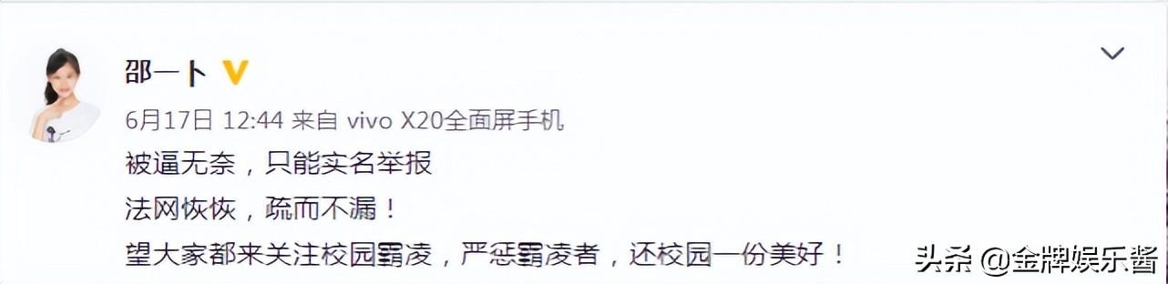 版权声明:我们致力于保护作者版权,注重分享,被刊用文章【2017校园暴力案例(知名童星邵一卜因校园霸凌轻生)】因无法核实真实出处,未能及时与作者取得联系,或有版权异议的,请联系管理员,我们会立即处理! 部分文章是来自自研大数据AI进行生成,内容摘自(百度百科,百度知道,头条百科,中国民法典,刑法,牛津词典,新华词典,汉语词典,国家院校,科普平台)等数据,内容仅供学习参考,不准确地方联系删除处理!;