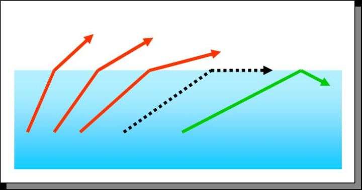此时,高海拔空气相对于靠近海平面的空气就是光疏介质,而靠近海平面的空气就是光密介质。如果此时,有一艘船反射的太阳光进入到空气当中,就很容易发生光的折射/全放射现象。