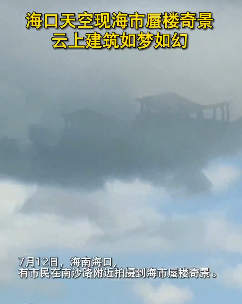 7月12日,海南海口市民,在南沙路附近拍摄到了罕见的海市蜃楼奇景。从画面中可以看出,云中漂浮着一个轮廓清晰的建筑物,在空中悬浮着搭配着烟雾缭绕,犹如“天宫”,非常罕见。