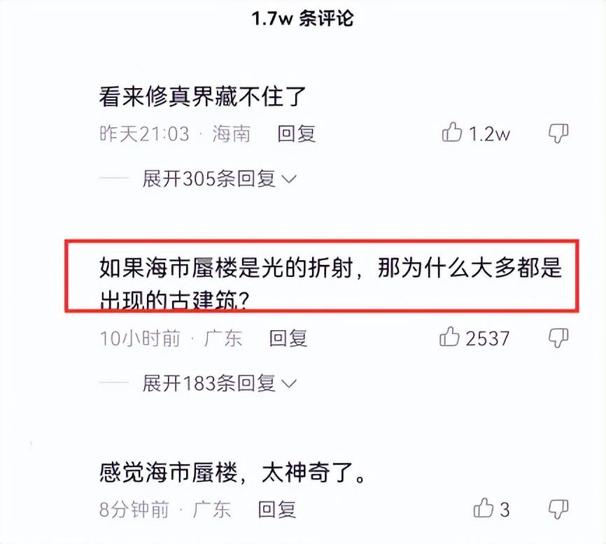 后来这个古建筑也被网友扒出来了,就是附近公园中的一个亭台,并非不存在。当然了,这个蜃景很大可能并不是蜃景,因为当地难以形成海市蜃楼,而且蜃景也不会如此清晰。