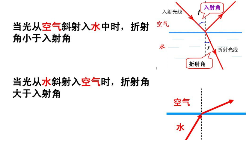 假设光从空气中斜入射到水中,光传播的路线会发生偏折,其中入射角会大于折射角。之所以会出现入射角大于折射角的结果,是因为空气这个介质是光疏介质,而水是光密介质。