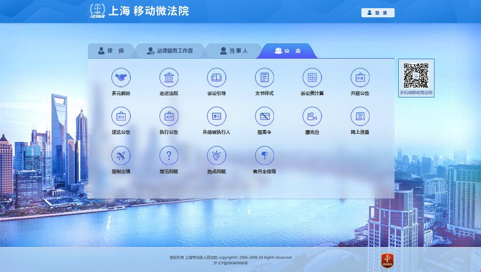 搜索“上海移动微法院”或者登录网址http://www.hshfy.sh.cn/shwfy/ssfww/index.jsp(点击右侧链接前往)即可进入“上海移动微法院”界面。