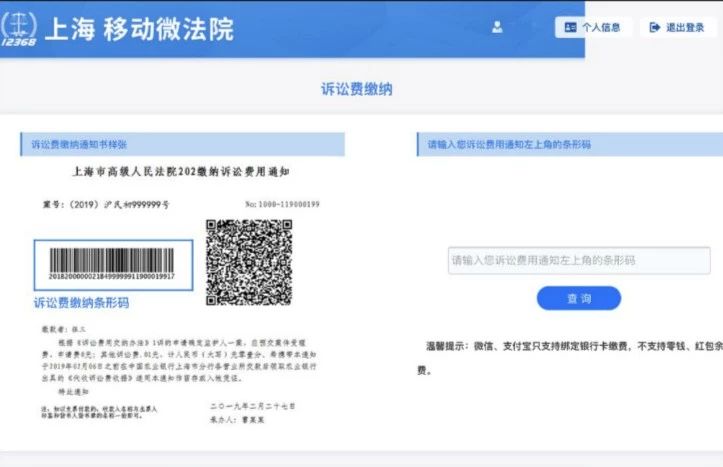 当事人收到立案短信通知后,登录平台,点击“诉讼费缴纳”,输入诉讼费用通知左上角的条形码,一键缴纳诉讼费用,系统自动生成并在线反馈支付凭证。
