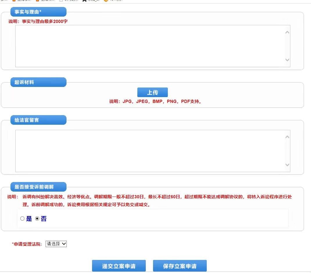按照系统提示的证据类型上传证据材料,点击“递交立案申请”,等待立案结果。