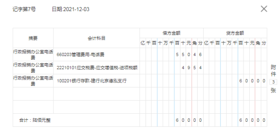 12月3日,行政报销办公室电话费价税合计600元,出纳网银支付。