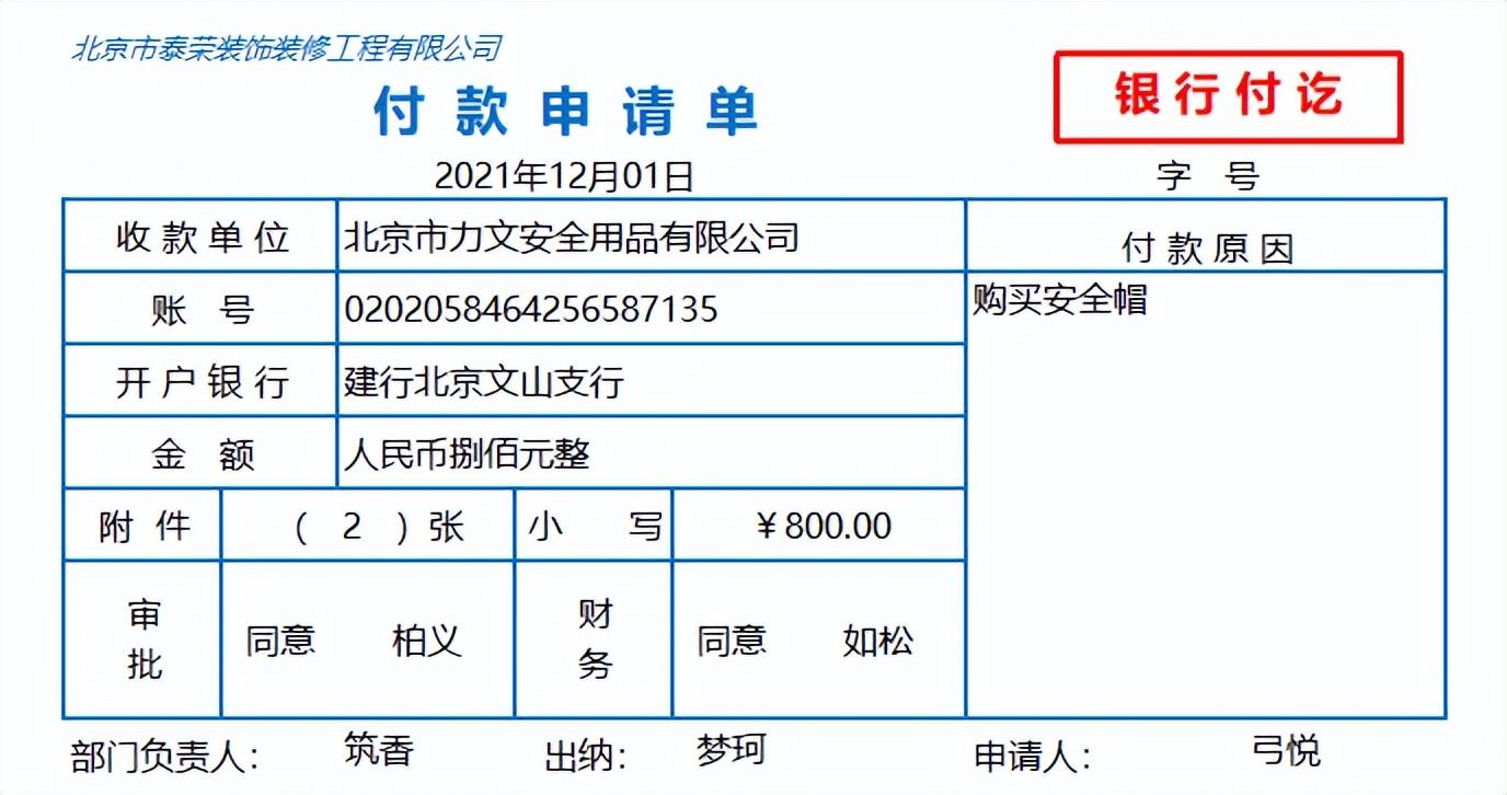 12月1日,采购员向北京市立德材料有限公司购买一批安全帽价税合计800元,于当日收到发票,出纳审核无误网银支付。