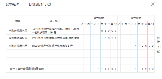 12月3日,采购北京中创项目水泥并收到发票,于当日运抵工程现场直接领用,价税合计1186.5元,出纳审核无误后网银支付。