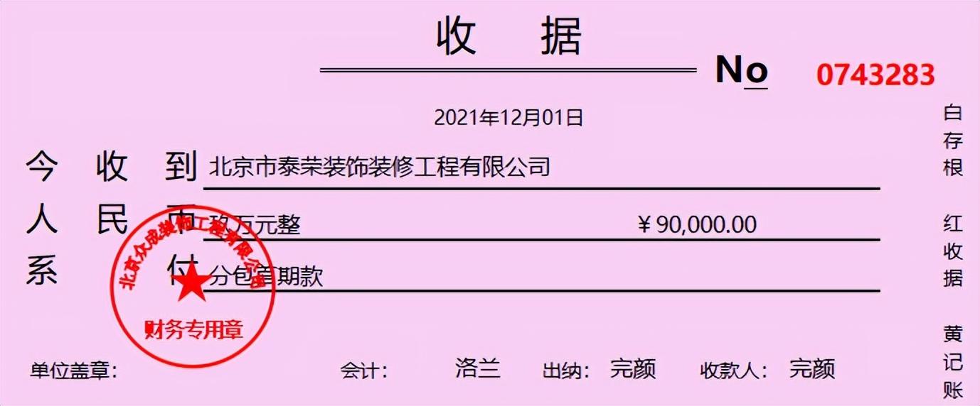 12月1日,与北京众成装饰工程有限公司签订分包协议300000元,将北京中创科技有限公司的宿舍区、展示区分包给该公司,合同约定先预付30%,支付分包首期款90000元,出纳审核无误后网银支付。(由于分包协议页数较多,此处不予展示)