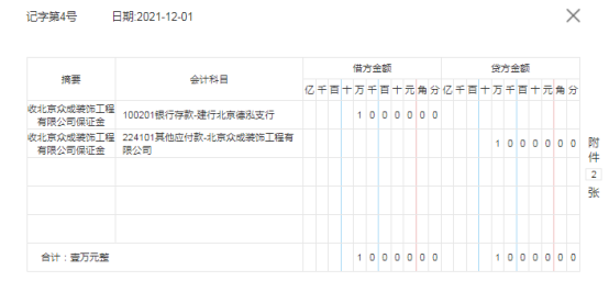 12月1日,网银收北京众成装饰工程有限公司的北京中创项目保证金10000元。