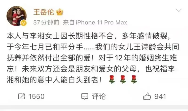 11月30日凌晨,王岳伦突然发文称“与李湘因长期性格不合,在今年7月和平分手。”后又将微博删除。