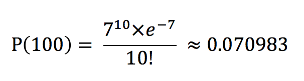 首先,固定时间由一天增加到一周,一周的平均点击则为7次,泊松分布的λ为7,要求转化数为10次的概率,泊松分布的概率质量函数的输入x为10,代入公式可以求出: