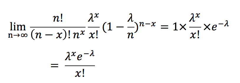 可以看出该媒体每周广告的转化数为10次的概率为0.070988。对比上面利用泊松分布的公式计算的值,发现二者值非常的接近,这是一种巧合还是一种必然?下面我们从二项分布的概率质量函数着手,由于二项分布中λ=np,将p=λ/n代入看看能有什么发现。