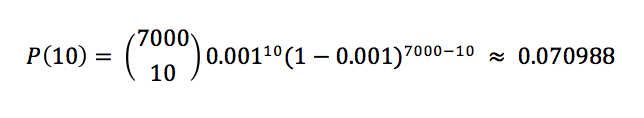 假设某媒体平台一天的用户广告转化数平均为1次,一天广告点击的次数平均为1000次,那么广告的点击转化率为0.1%,我们现在根据二项分布来计算,该媒体平台每周广告转化数为10次的概率。