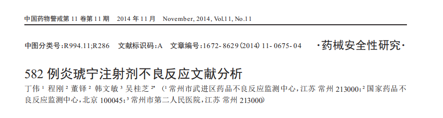 2014年,《中国药物警戒》曾刊登一篇学术文章探讨炎琥宁注射剂致不良反应的一般规律和特点,题为《582例炎琥宁注射剂不良反应文献分析》,作者来自国家药品不良反应监测中心、常州市武进区药品不良反应监测中心和常州市第二人民医院。