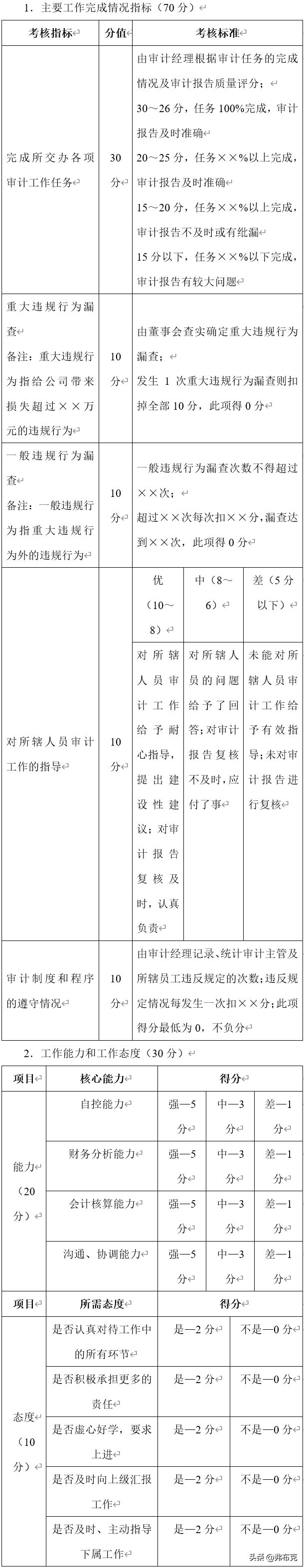 审计主管的绩效考核,主要从其工作业绩和工作态度、工作能力两大方面进行考核,具体的指标内容及考核标准如下: