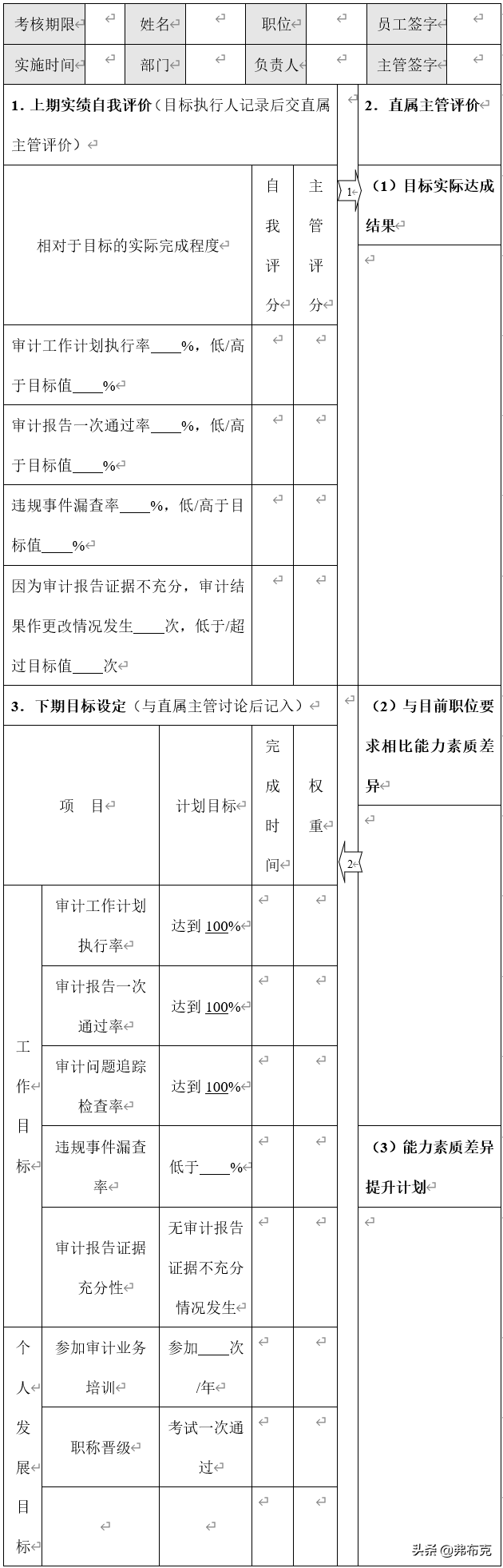 根据审计主管岗位的主要工作内容和审计任务需要,用以评价上期工作效果和为下期工作设定目标,目标管理卡设计如下。