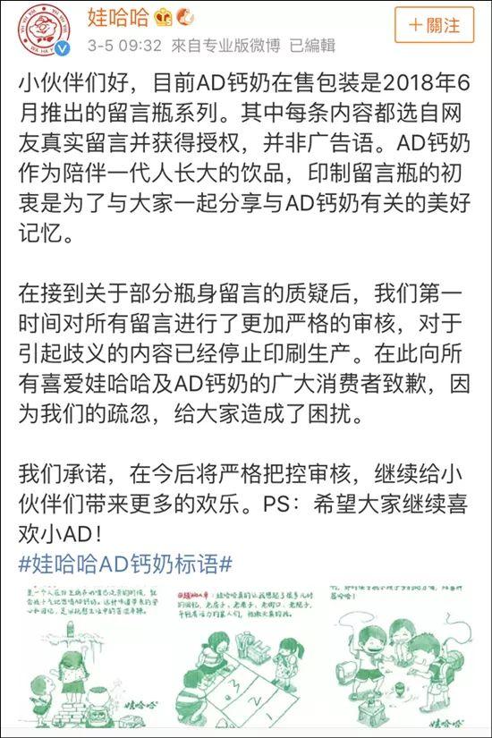 娃哈哈集团官方微博紧急回应,标语并非广告语,内容选自网友留言,对引起歧义内容已经停止印刷生产。