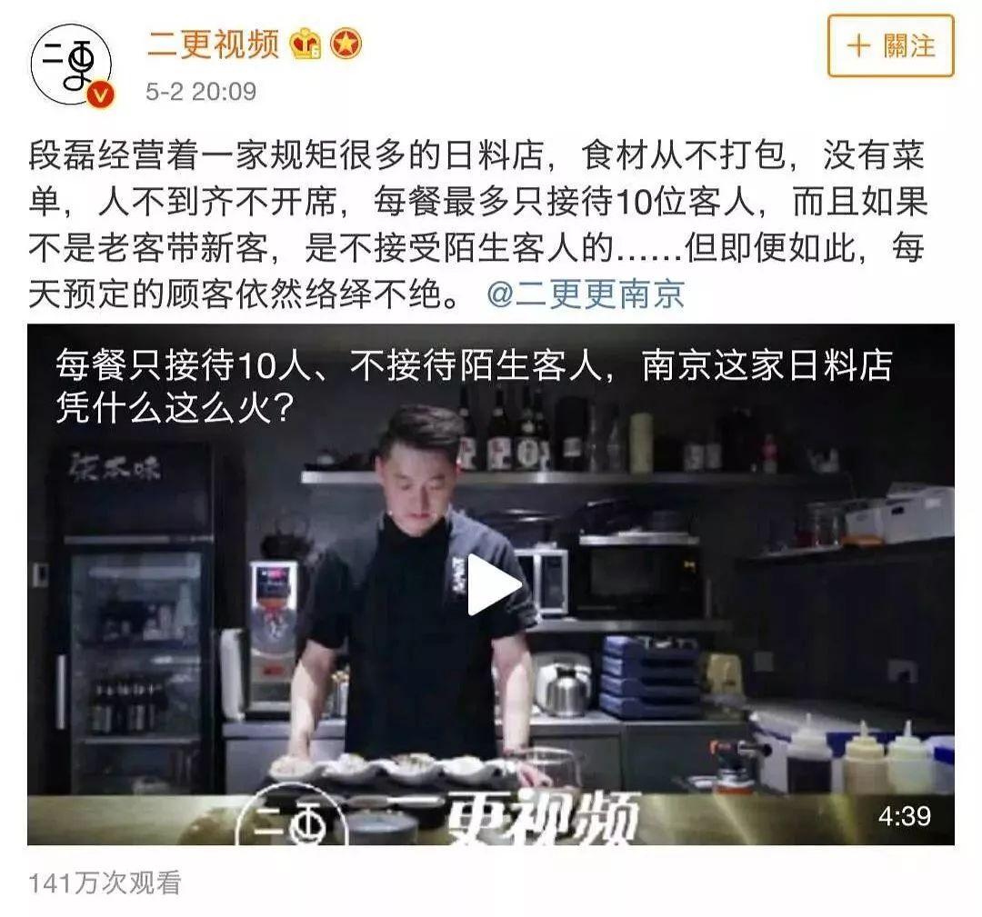 5月,二更视频给一家名为「柒本味」的网红日料餐厅做了一期视频。「食材不打包」、「不批量生产」、「一分钟内食用」等等,二更成功为柒本味塑造了一个「有规矩」的设定。