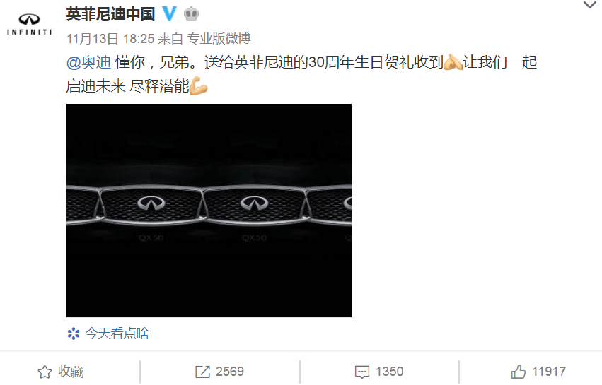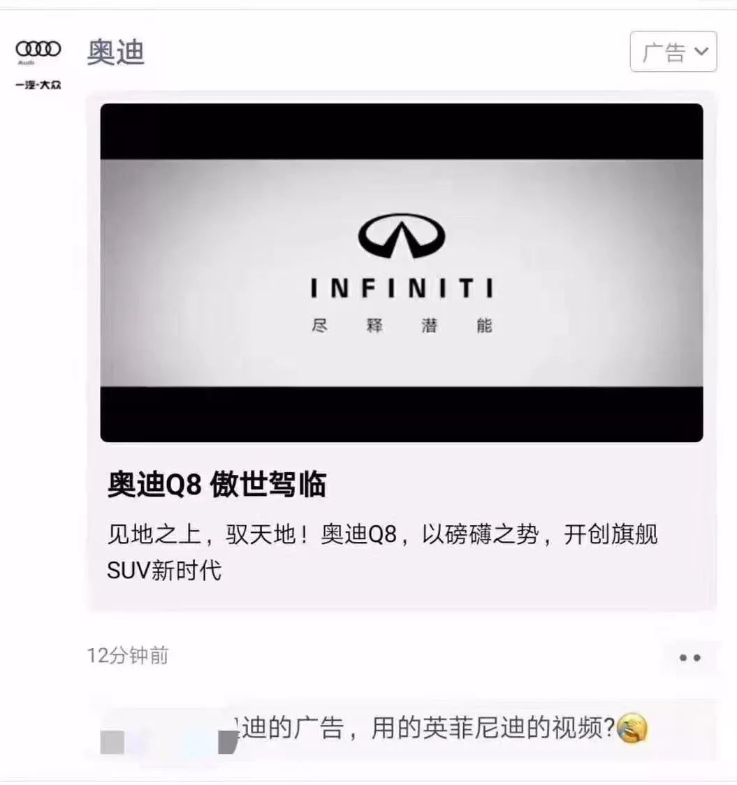 11月13日,广告圈最大的瓜来了,奥迪在投放朋友圈广告时,广告视频内出现的竟然是英菲尼迪的内容,连标志和宣传语都是INFINITI。