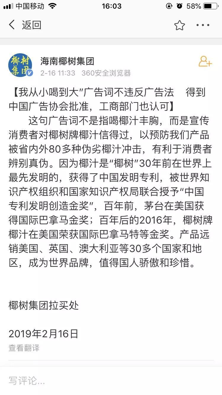 在引发不小争议后,海南椰树集团官微发布声明,表示“从小喝到大”这句广告词并没有违反广告法,且已经得到中国广告协会批准。