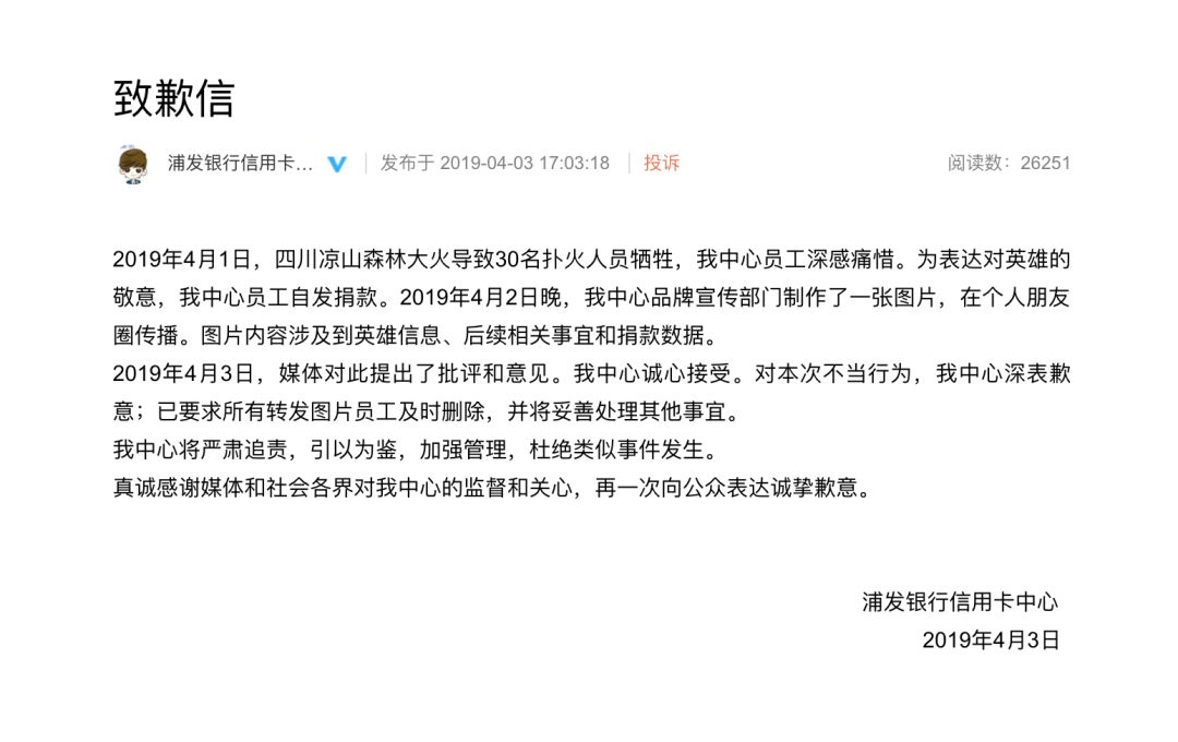 在网友的大量抨击之下,浦发银行信用卡中心不得不发布了一份道歉信。称这张图片是宣传部门所制作,且强调只在个人朋友圈传播。