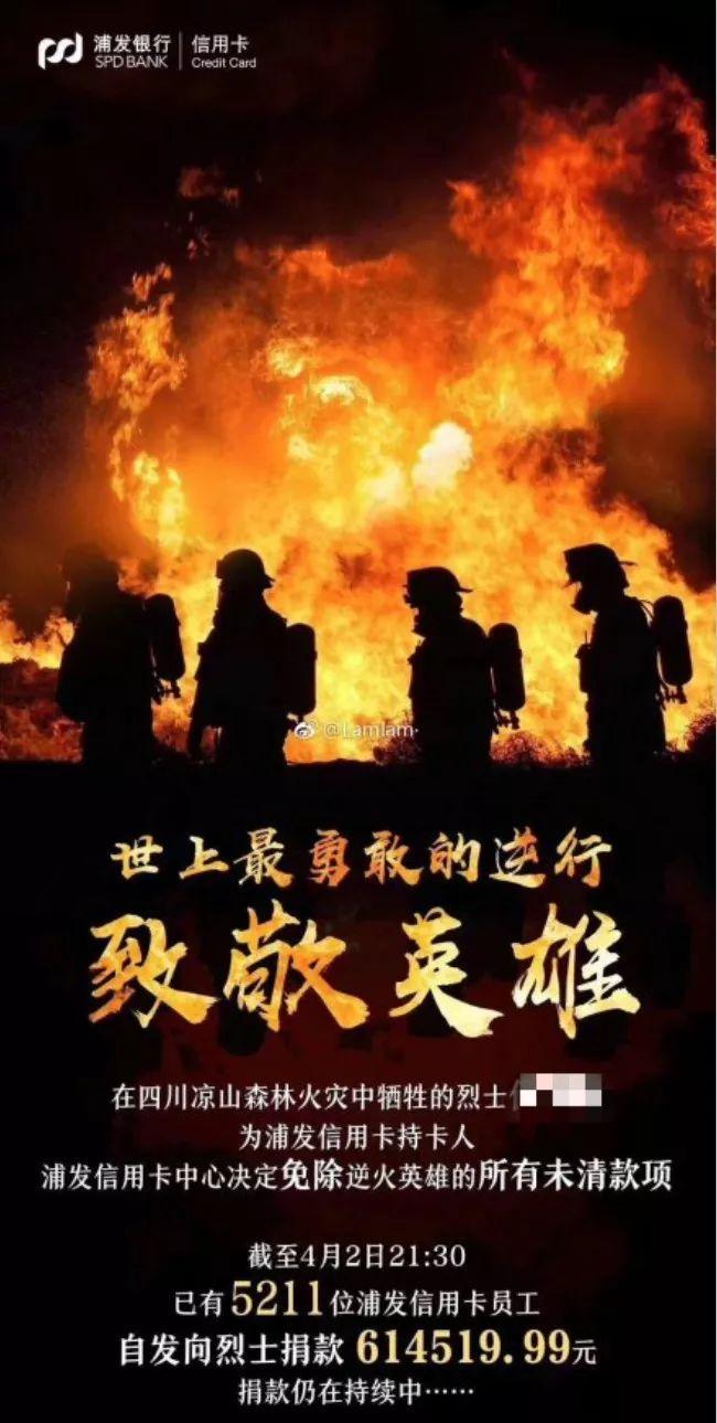 3月底,四川凉山森林大火事件备受关注,31位救火英雄壮烈牺牲。在这一背景下,4月2日,一张浦发银行信用卡中心免除凉山火灾烈士信用卡未还清款项的海报在网络上被大量转发。海报上赫然写着,某烈士为浦发银行信用卡持卡人,浦发银行信用卡中心决定为其免除所有未清款项。并且还公布了员工向烈士捐款的数量和金额。