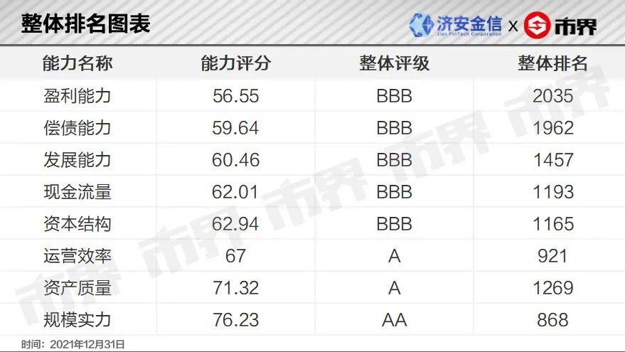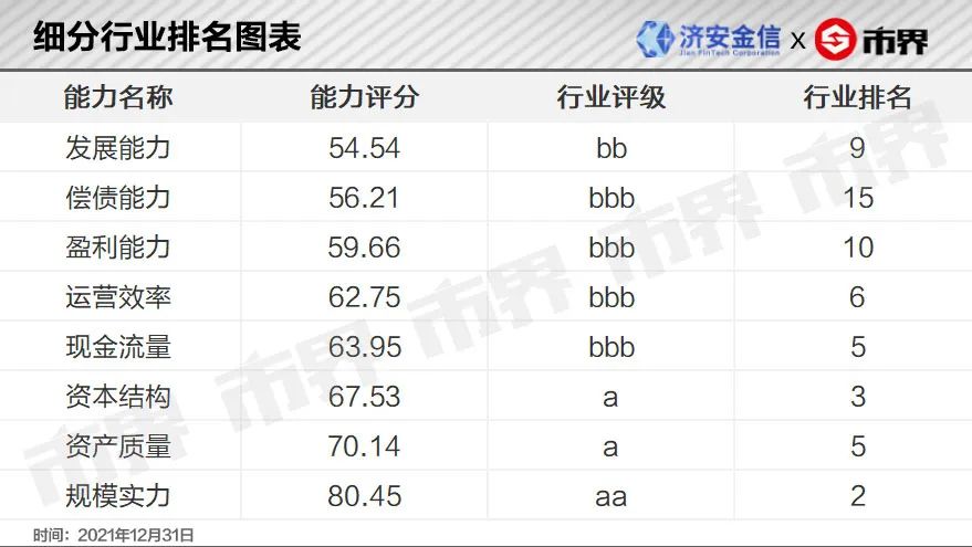 市界联合国内专注于证券与基金行业研究的第三方评价机构济安金信共同推出《上市公司竞争力分析》栏目,通过自研评价体系,从资本结构,资产质量,现金流量,发展能力等八个维度(基于行业、地域和规模不同,相应调整财务指标集合与指标权重)对各细分行业内所有上市公司进行多维度体检、评级;并对若干公司具体分析,形成报告。
