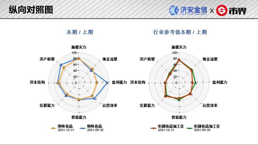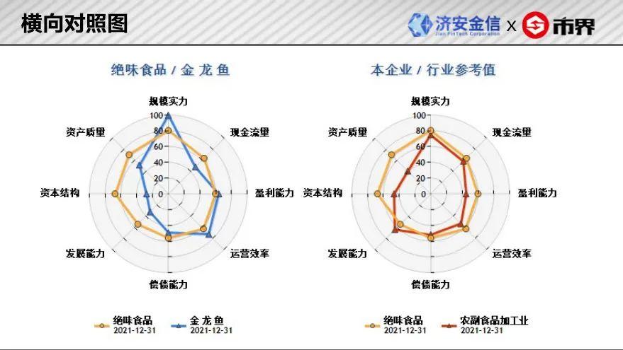 左图是上市公司绝味食品与本行业龙头公司金龙鱼(300999)在本期(2021年四季度)财务结构之间的比照;