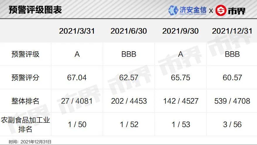 2021年四季度绝味食品预警评级从A下滑至BBB。当期绝味食品的能力短板分别是发展能力、偿债能力、盈利能力。