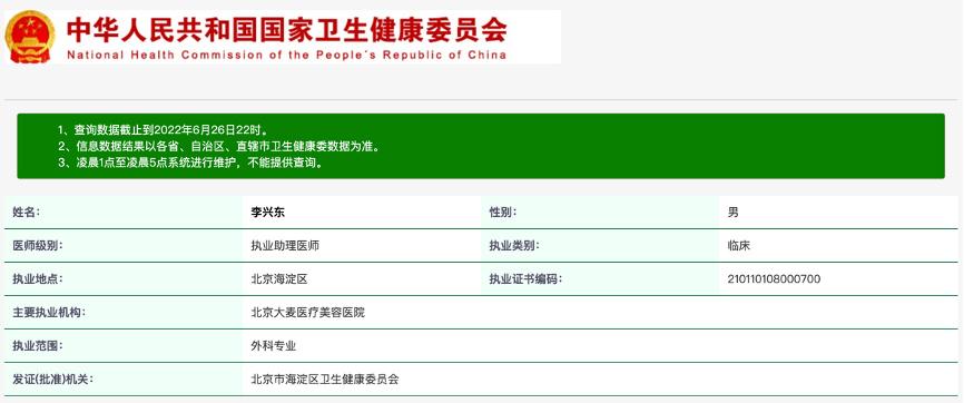 但《财经天下》周刊发现,在国家卫健委医生执业注册信息查询系统中,能查询到的信息显示,李兴东至今还只是个执业助理医师。根据公开的简历,李兴东于2003年6月毕业于天津医科大学,取得大专学位。直到2013年,他取得了内蒙古自治区卫生厅颁发的执业助理医师资格证书。一年后,北京海淀区卫生局为其颁发了执业助理医师执业证书。
