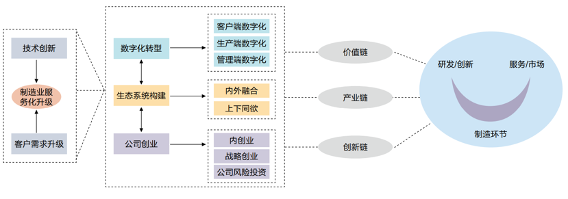制造企业起初是以生产销售高质量产品为主,但随着产品销售完成,企业需要为产品提供基本的售后服务,这是制造企业服务化的起点。随着竞争的加剧以及客户需求的变化,对服务专业性的要求越来越高,服务的重要性逐渐增加,产品成为服务的载体。基于产品,企业需要为客户提供售后、安装、调试、维修、保养等一系列服务内容,沿着价值链进行服务化延伸。有的企业通过向价值链上游延伸,通过研发设计的投入实现服务化;有的企业通过向价值链下游延伸,通过营销和品牌知名度实现服务化;有的企业同时向上下游延伸,同时实现技术服务化和市场服务化。