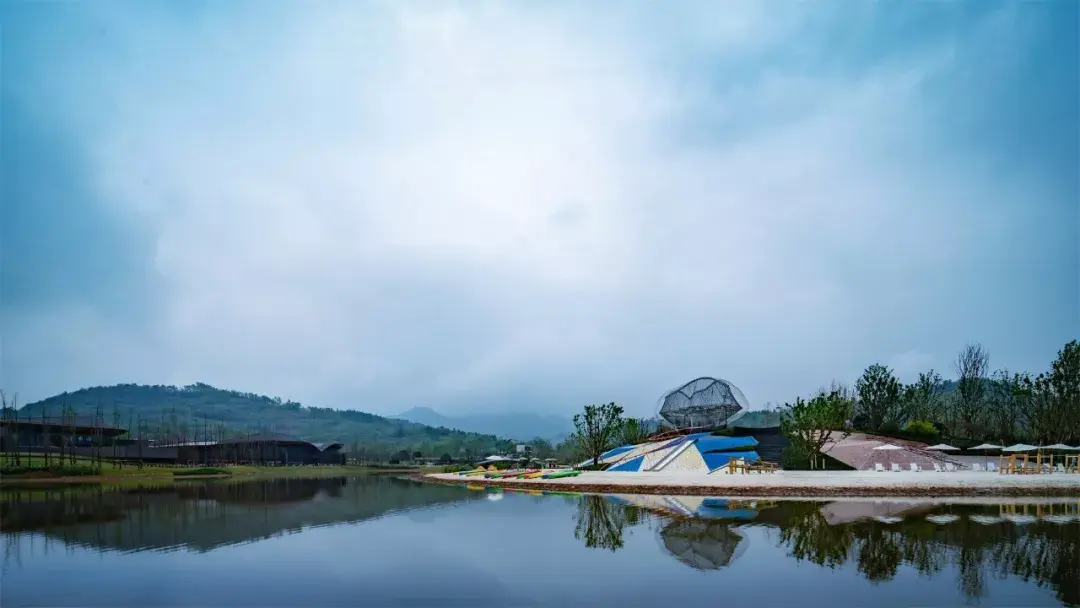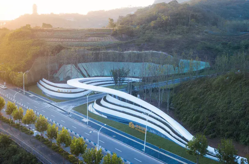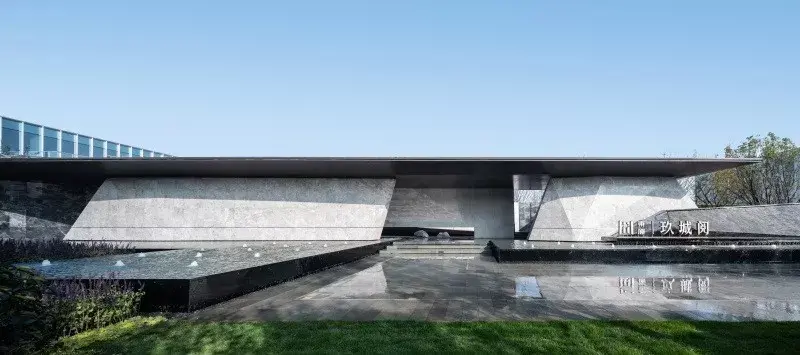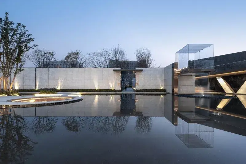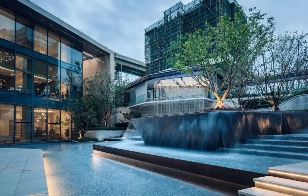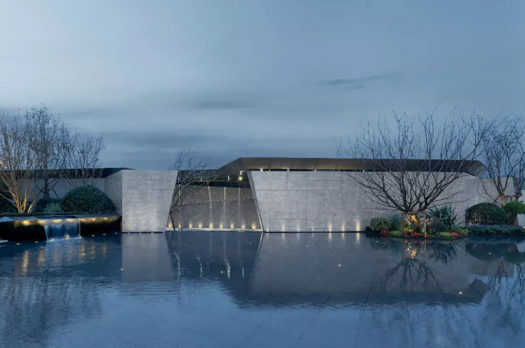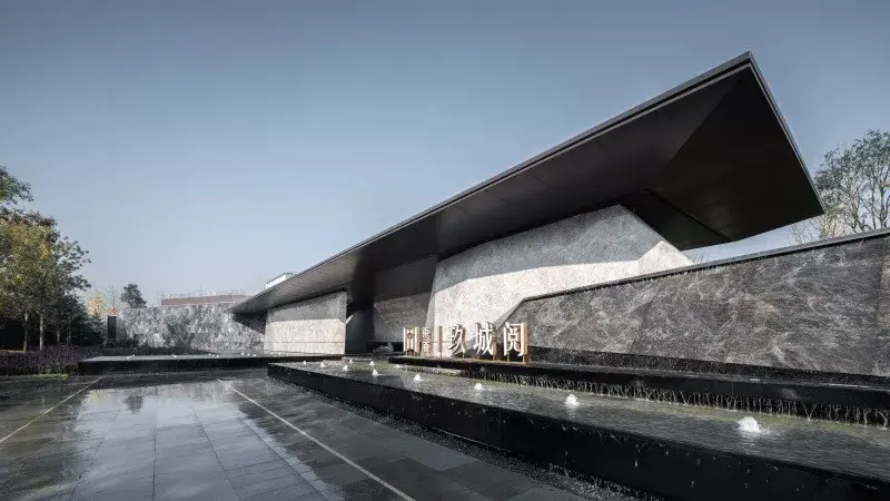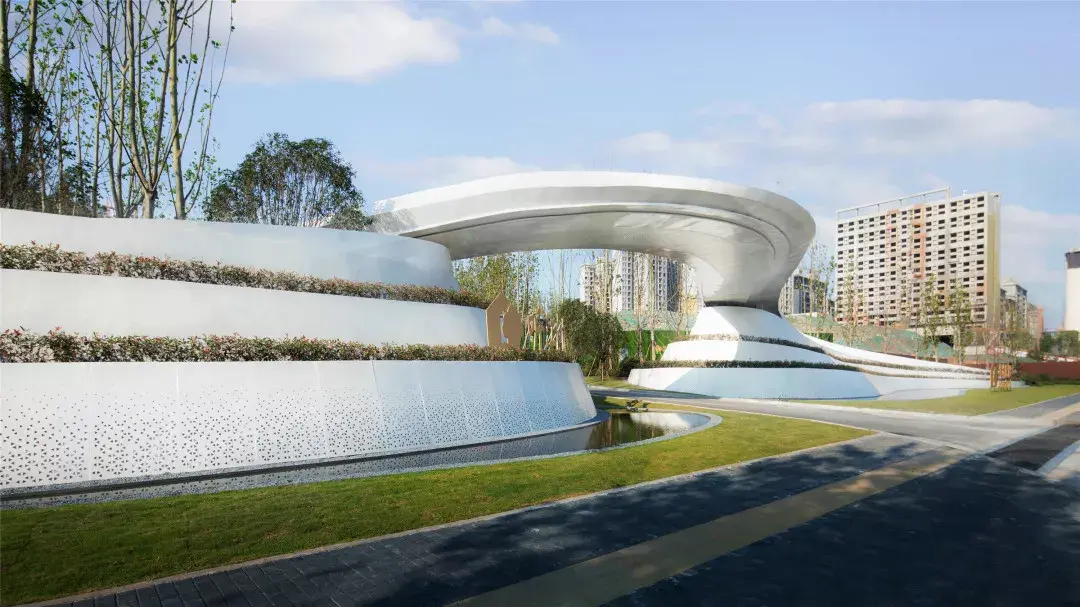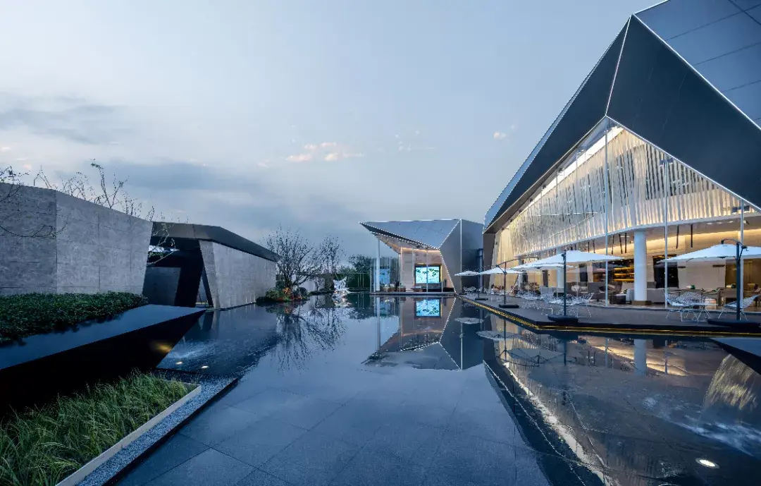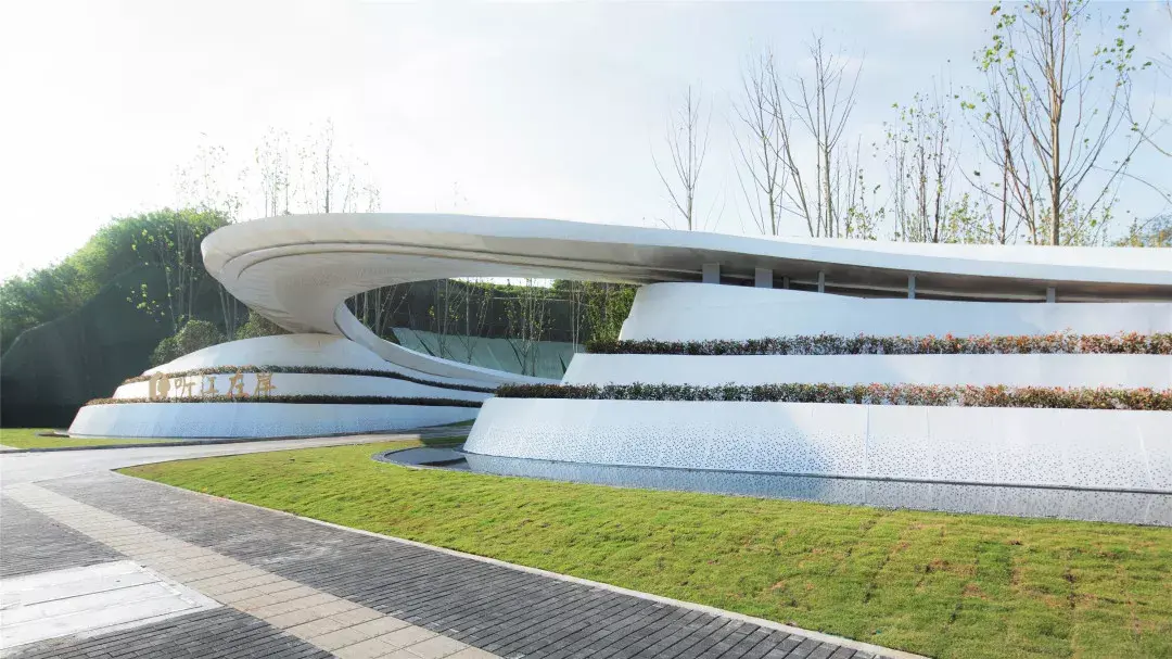 项目需从引道下穿涵洞进入前场,大乔花镜、流水叠瀑、艺术景墙是未来生活场景的最真实的昭示。示范区入口前场的空间序列在成都天府大道依次展开,使项目的品质感在城市沿界面得到最大限度的展示与延伸。设计师根据场地原始地形的山水田园地形基调,保持其基本的原山、原水、原田三大自然要素,构建可行、可游、可居的大型人文社区。